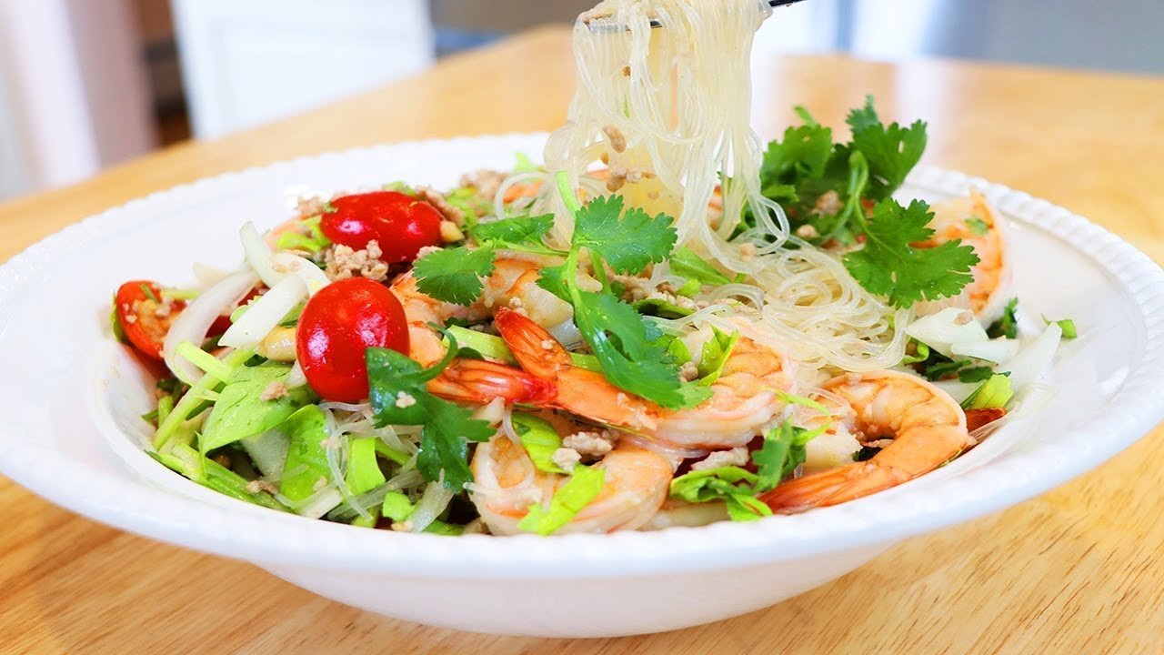 Meeresfrüchtesalat (scharf) mit Glassnudeln Tomaten, Zwiebeln und frischem Sellerie.